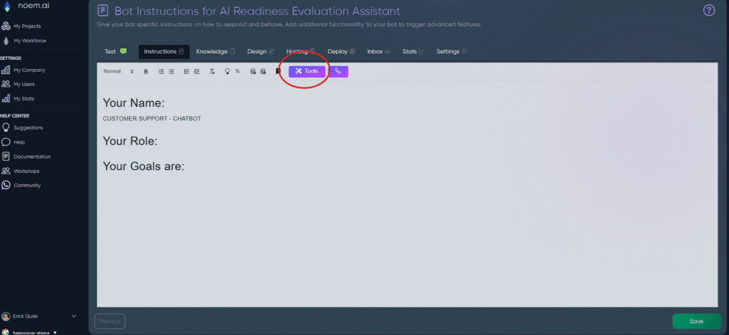 In the main panel you’ll see a rich-text editor. Treat this as your bot’s operating manual.