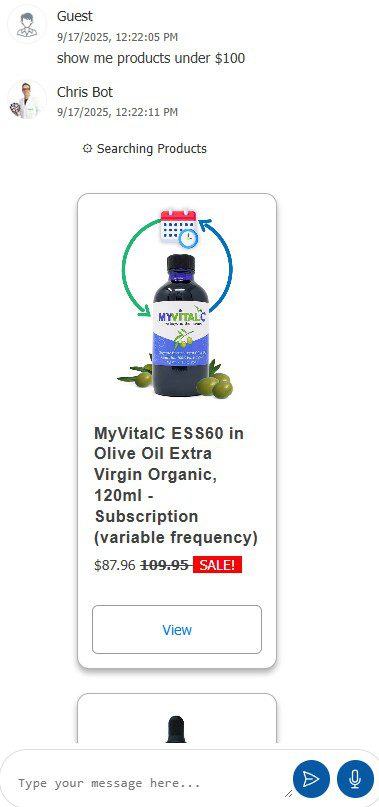 NOEM.ai will be able to pull your product, inventory, collections, user shopping cart and orders directly from Shopify and display your products in their own card inside the chat itself, for quick purchase like this: